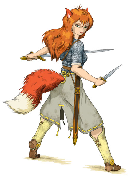 Faaxen are usually slender, often intelligent and 'clever', often wry and quick witted, 'eccentric', and are believed to have evolved from foxes. They build well planned (well laid out) highly fortified villages and cities with mostly masonry buildings in a style reminiscent of 'Tudor' construction with blue or sand coloured 'cob' and dark brown or indigo stained or painted timbres (or, more recently, metal plated timbers that resist fire.) Many of their buildings have interesting, even 'odd' shapes, which may aid the positive flow of magickal energies, or may just please their eccentric set(s) of aesthetic values. Many of their villages and cities have mazes of interconnected tunnels beneath them. Architects, Healers, Wizards, Researchers and Thieves [whose convoluted ethics baffle anyone who is not a Faax] are 'the five pillars of Faaxen society', and always enjoy the respect and public honours of "99.7%" of Faaxen. Having a Faaxen thief proudly wear something he or she has stolen from you is supposed to be an honour. Incorruptible Faaxen Guardsmen (and women) make a game of stealing back items, wearing them for a day [if possible, or somehow displaying larger or unwearable items in public] and presenting them to anyone who has formally complained that a thief has stolen something they can't bear to part with. (Feathery plumes on their soldiers' and guards' ceremonial hats often take the place of combat medals.) Many become obsessed with magick in any form. This race has a height distribution from 135 to 195 centimetres. [4.5 to 6.5 feet] The hitpoints and spellpoints for this race are: