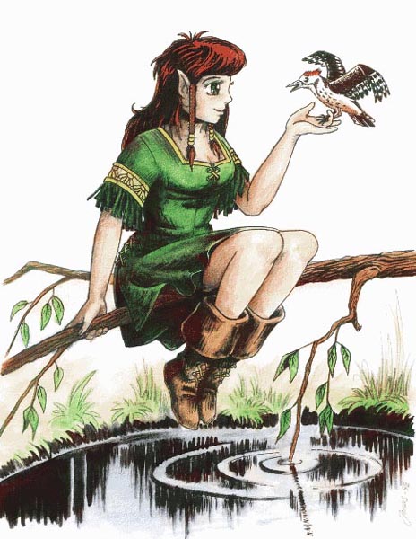 Forest Elves are extremely sensitive to their surroundings and are natural druids and empaths. Most of them have no use for Orthodox Magick. They have learned to value their own culture and ignore the constant criticism of Highe Elves. Their ears aren't quite as pointed as their Highe Elf cousins'. [[ Image by Jonas Nelson, (I have asked permission to use this) see his stuff at Elfwood ]] This race has a height distribution from 135 to 195 centimetres. [4.5 to 6.5 feet] The hitpoints and spellpoints for this race are: