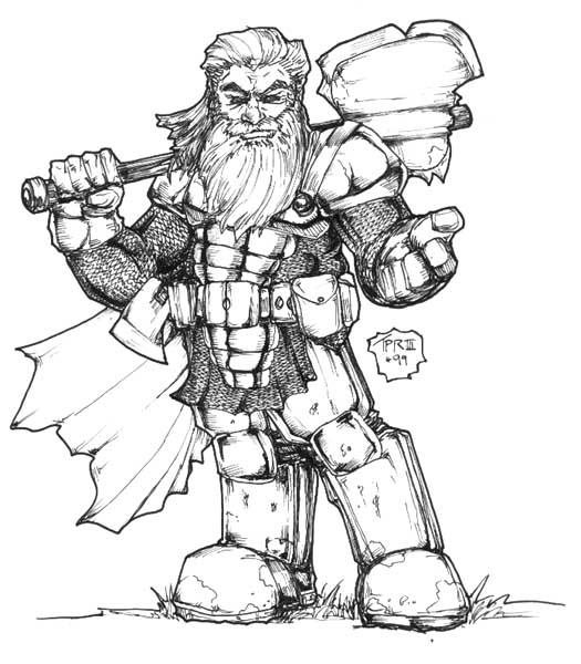 (Delvahrians) (They don't like being called Dwarves). Delvahrians are short and solidly built, live near deposits of precious ores and have two obsessions: Mining and Religion. They have unusually high resistance to most forms of Magick, which they credit to divine intervention. They are able to channel Religious Magick and sometimes manage to use musical magick, but can't get the knack of Orthodox or Wild Magick. Female Delvahrians don't really grow beards, they may wear the beards of male ancestors when they journey among members of other races. They are struggling to understand concepts of nurturing, for, while they love and even treasure children, millenniae of stern disciplinarianism has only recently been thought to have caused vast numbers of their offspring to 'die of loneliness'. The race credits Ottarians with saving a critical city during a hopeless battle against overwhelming odds, and Delvahrian mothers whose children played with Ottarians noticed that those children had a much higher survival rate than those who did not. It began to dawn on them that Ottarian styles of bonding and nurturing made an incalculable positive difference in the lives of their young. [[ Image at right by Thomas Patrick Reidy III, (I have asked permission to use this) see his stuff at Elfwood ]] This race has a height distribution from 90 to 135 centimetres. [ 3 to 4.5 feet tall ] The hitpoints and spellpoints for this race are: